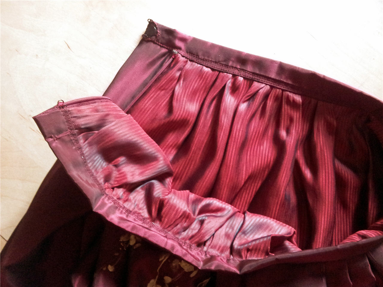 The fabric actually is a bit stretchy – it’s a poly-spandex mix. I could have made it into a pull on skirt. But I wanted a tight fit around the waist and avoid bagginess from over-stretching the fabric. So I’ve kept the invisible zipper that was already in the dress. I also stablized the waist seam with clear elastic sewn into the waist seam allowance – a trick I picked up from a few Victoria’s Secret skirts and dresses.