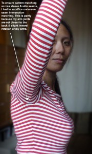 The sleeve I only muslined for the Stretchy Knit. It came out rather long! Also the default instruction doesn’t cater for my twisted arms. I shortened the sleeve & shifted some width at bicep / underarm from front to back and at wrist from back to front. So now it looks asymmetrical like my woven Sleeve Blocks but feels more comfortable.