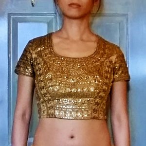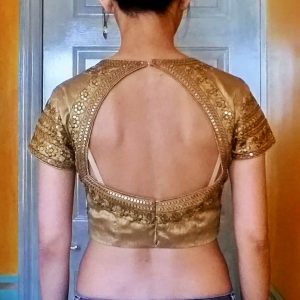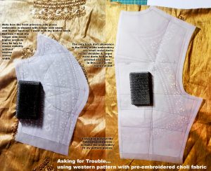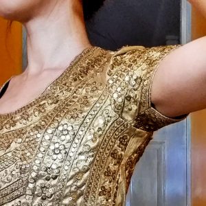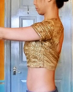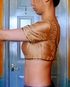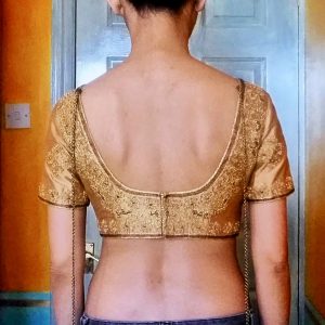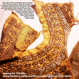 So there you have it (I think, for now anyway), if you want open neckline to stay on the shoulders, go with stretch Choli Blouse with 0 or even negative ease. If you insist on lovely pre-embroidered woven choli fabric with low open necklines, then stop being stubborn & keep that dori back neck-tie. That’s me told off then! 🙂
