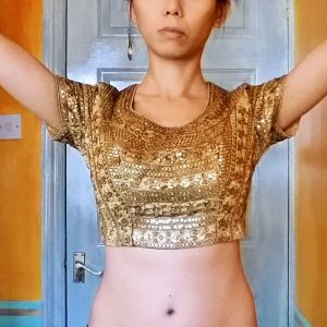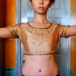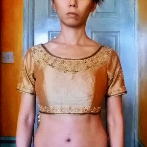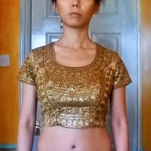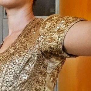 Lowered neckline (aka unintentional off-the-shoulder look) wasn’t an issue in this version as I used the cross-back ties that one finds in many authentic Indian choli.