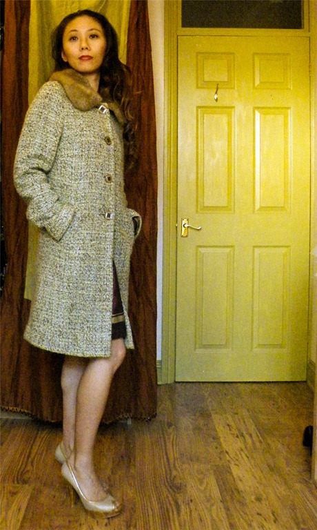 Big Bertha getting decadant & vain: Pilfering another piece of silk I was considering as an accent fabric, and my furry pillbox hat-to-be on her neck. It’s faux fur on one side and faux suede on the other. I’m too scared to sew into it as any mistake would be fatal – the faux suede once pierced is pierced forever. But winter is coming so one day soon I will take the plunge. Especially as faux fur stole seems to be all the rage in the shops right now.