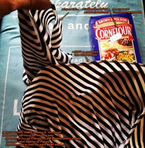 Homemade starch: My last few knit projects I’ve used commercial spray starch. This time I ran out of the commercial stuff & as I was stuck at home waiting for delivery I had to give homemade starch another try. I tried the proportion of 3 teaspoon corn starch/flour to 1 cup water suggested by someone who sew a lot of jersey knits and this time it worked a treat! Not only did the stitch area becomes stiff & stable as thin cardboards, it tamed the curling edges, and bonus – it acted as temporary glue sticking the two sides of the seam together – great for matching wiggly stripes! One down side is that it took many MANY rinses to get the starch out. But definitely much saner than unpicking stitches multiple times! Will have to test some more. I had tried homemade starch before but abandon that for some reason. May have been clogged spray nozzle. Or maybe trying to use that on water-hating petro-checmical fiber like poly-lycra.
