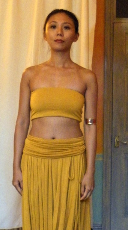 But I clung to the original dress’ empire waistline, and this was a mistake. I looked like a pregger wench in the resulting dress. To avoid any well meaninged but awkward conversations about when I’m due, I separated the bodice from the skirt. I had just finished the Sari Top Fix-It, so was in a cropped top mood anyway. And you know how I feel about committing to a dress – I much prefer separates that give me more options.