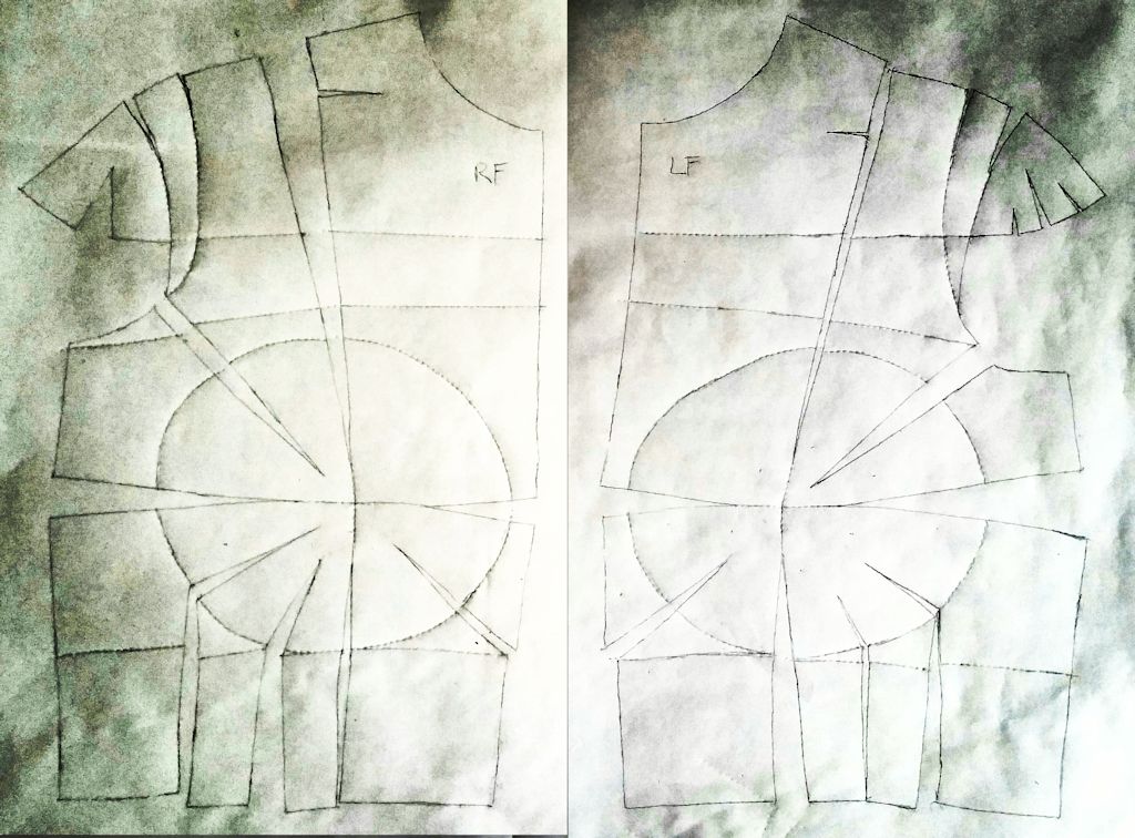 Additional dart shaping (bust, waist, shoulder blade) were done at the existing panel seams with varied seam allowance widths.