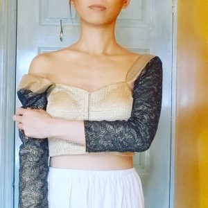 The scrap hem border from the tunic just barely goes around my torso. As the embellishment is so lovely, it seems a shame to throw it away. Taking inspiration from a Dolce & Gabbana editorial & a Alexander McQueen F/W 2008 designs, I think I will turn this into a bustier. To bridge the gap in girth I’m going for a contrasting deconstructed aesthetic of exposed zipper, braided elastic, or hook & eye tape. To maximize wearability, I may add sleeves & peplum – or maybe make this a separate top to be worn under the bustier. I have nothing as fancy as McQueen’s silk tulle, so instead I’m going to use a plentiful cheap gauze from the Stash (formerly window drapes). Haven’t quite work out the pattern yet let alone construction. So yet another project joining the long queue.