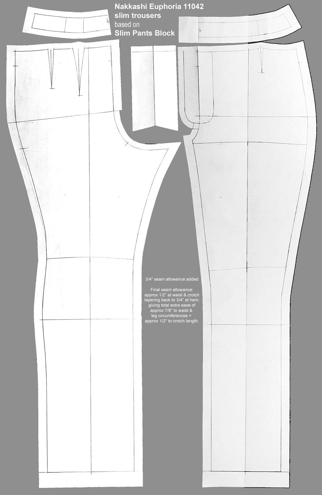 Fitting: To accommodate lining bulk & my middle age spread, added ease by sewing approx 1/2″ SA instead of the 3/4″ SA added to the pattern for side seams & inseams. This gave me approx 7/8″ extra ease at the waist tapering to no extra ease at the bottom of the legs, almost 1/2″ extra crotch length.